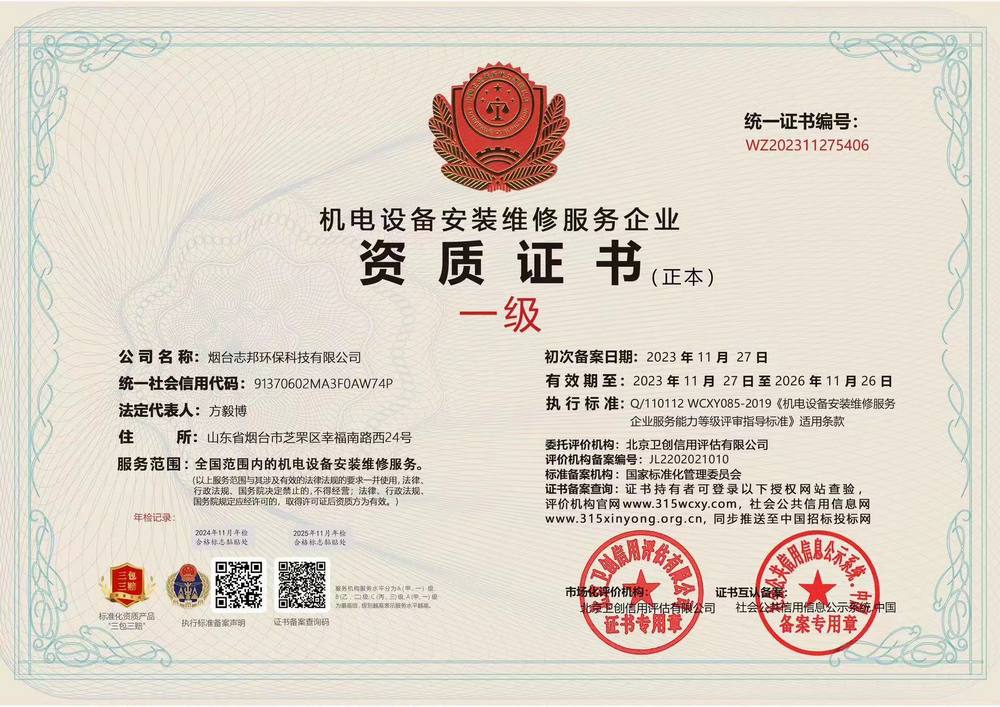 環保工程(施工、設計、安裝、運維)服務企業資質證書